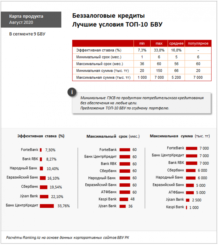 Лучшим по всем показателям является ForteBank, предлагающий 7 миллионов тенге на срок до 60 месяцев под минимальные 7,3 процента. Следом за ForteBank идут Bank RBK со ставкой от 8,27 процента и Народный Банк - от 10,4 процента и снижением суммы до 6 миллионов тенге.