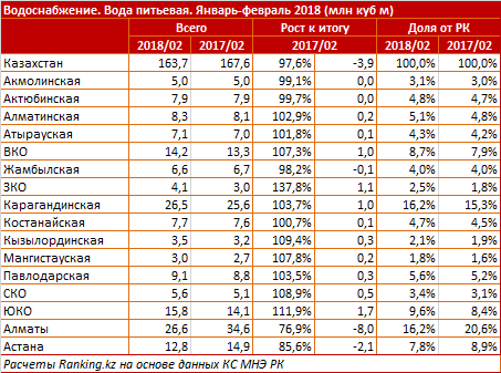 Поставки питьевой воды за январь-февраль 2018 составили 163,7 миллиона кубометров - на 2,4 процента меньше, чем в аналогичном периоде прошлого года. Это 38,8 процента от всей природной воды, обеспеченной водохозяйственными предприятиями по РК.