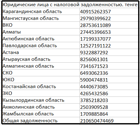Стоит отметить, что "лидером общего зачета" является одно из нефтяных предприятий в Мангистауской области с налоговой задолженностью более 13,776 миллиарда тенге. Это гораздо больше общих долгов бизнесменов, к примеру, из Павлодарской области, находящейся на шестом месте в общем списке с суммой в 12,527 миллиарда тенге.