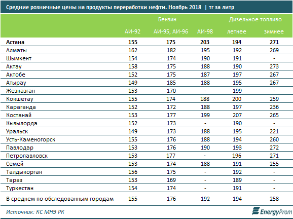 В ноябре 2018 года в среднем по городам страны цены на популярный бензин АИ-92 снизились на 4,4 процента, до 155 тенге за литр. Стоимость АИ-95/96 также снизилась (почти на 1 процента, до 176 тенге за литр), а на АИ-98 - увеличилась (почти на 2 процента за год, до 192 тенге за литр). Примечательно в то же время, что цены на дизельное топливо сильно выросли: летнее подорожало на 22,4 процента, зимнее - почти на 23 процента за год. Спрос на дизельное топливо казахстанские производители обеспечивают на 93,5 процента.