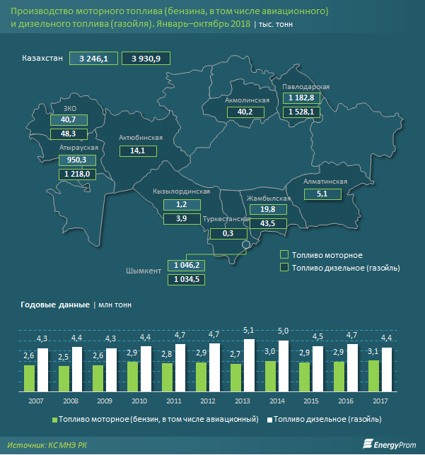 Наибольшие объемы выпуска пришлись на Павлодарскую область: 36,4 процента производства бензина (1,2 миллиона тонн, +7,6 процента за год) и 39 процента производства дизельного топлива (1,5 миллиона тонн, +19,1 процента за год). Здесь расположен один из мощнейших НПЗ - Павлодарский нефтехимический завод. 32,2 процента производства бензина и 26,3 процента выпуска дизельного топлива обеспечил Шымкент, где работает Шымкентский НПЗ - ТОО "ПетроКазахстан Ойл Продактс" (ПКОП). Атырауская область обеспечила 29,3 процента производства бензина и 31 процент дизеля. Здесь действует Атырауский нефтеперерабатывающий завод (АНПЗ).