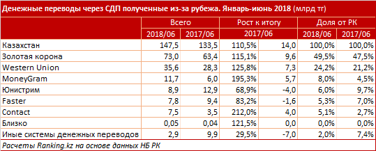 Следом идет Western Union - 35,6 миллиарда тенге, рост на 25,8 процента. Доля от РК выросла с 21,2 процента до 24,2.
