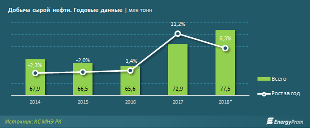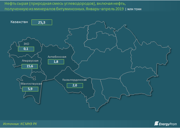 Добыча сырой нефти за четыре месяца 2019 года в натуральном выражении составила 25,3 миллиона тонн - на 0,2 процента меньше, чем в 2018-м. Почти 62 процента добычи пришлось на Атыраускую область (15,6 миллиона тонн, +1 процент за год). Это единственный регион из тройки ключевых, закончивший период в плюсе.