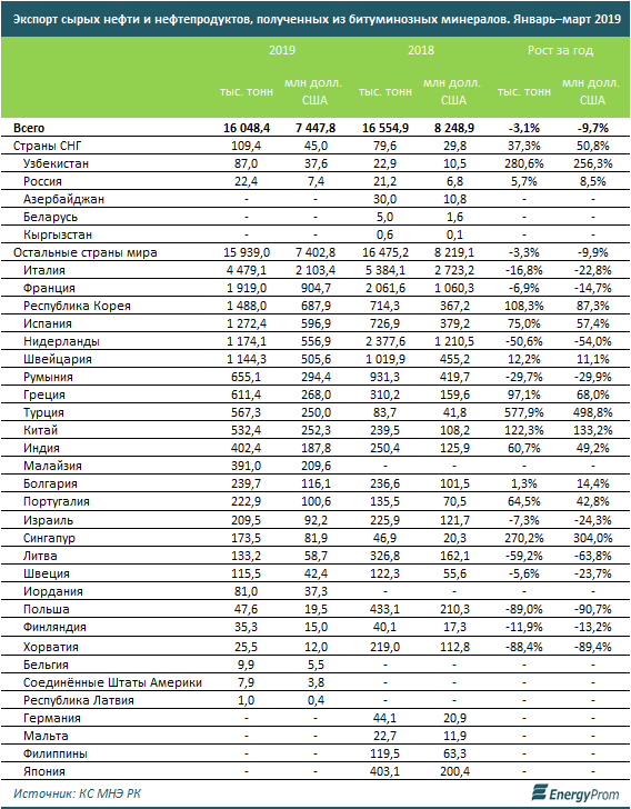 Пока на фоне сокращения добычи экспорт сырой нефти также уменьшился год к году: на 3,1 процента в натуральном выражении (16 миллионов тонн) и на 9,7 процента - в деньгах (7,4 миллиарда долларов). Основной импортер казахстанской нефти - Италия (4,5 миллиона тонн за январь–март 2019-го, на 16,8 процента меньше, чем в аналогичном периоде годом ранее). В деньгах поставки составили 2,1 миллиарда долларов - сразу на 22,8 процента меньше, чем годом ранее.