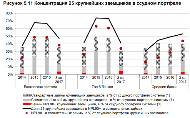 "По всем группам банков отмечается высокая концентрация ссудного портфеля в крупнейших заемщиках. По состоянию на конец третьего квартала 2017 года совокупность займов 25 крупнейших заемщиков каждого банка занимает 35,5 процента ссудного портфеля системы, в отдельных банках концентрация риска в крупнейших заемщиках намного выше. Займы 25 крупнейших заемщиков банковской системы занимают 8 процентов ссудного портфеля", - говорится в документе.
