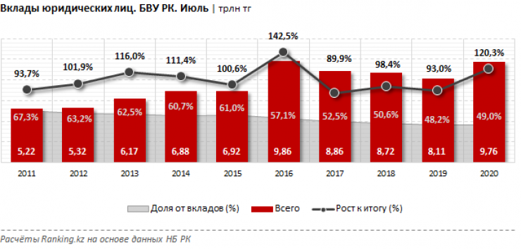 В кризисном 2020 году корпоративные вклады выросли на 12,6 процента с начала года, до 9,76 триллиона тенге. При этом непосредственно казахстанские банки прибавили 9,1 процента за этот период, совокупный портфель вкладов юрлиц составил в этом сегменте 6,56 триллиона тенге по итогам июля. Еще 3,19 триллиона тенге пришлось на иностранные дочерние БВУ и банки с иностранным участием.