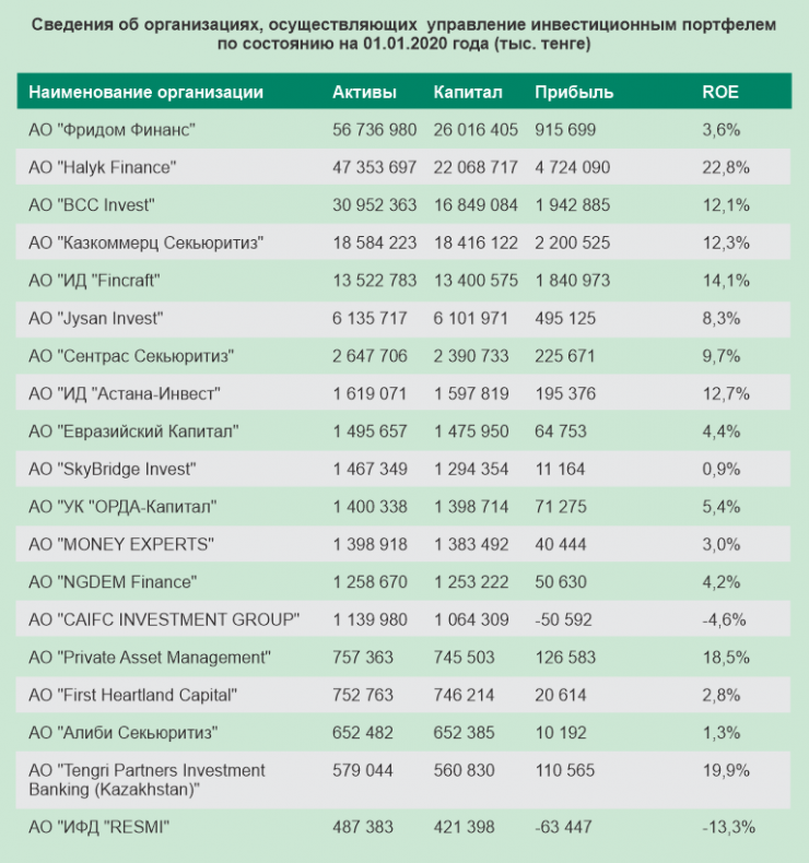 При выборе инвестиционной компании большое значение имеет ее надежность. Важным фактором, свидетельствующим о надежности и устойчивости компании, а также в целом дающим представление о масштабах ее бизнеса, является ее финансовое состояние, отмечают эксперты. Так, все пять крупнейших компаний закончили год с прибылью: "Фридом Финанс" заработал 916 миллионов тенге, Fincraft – 1,84 миллиарда тенге, BCC Invest – 1,94 миллиарда тенге, "Казкоммерц Секьюритиз" – 2,20 миллиарда тенге, Halyk Finance – 4,72 миллиарда тенге.