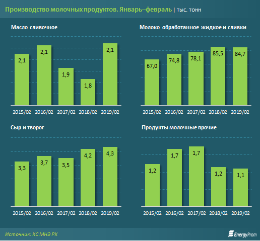 В то же время при росте потребления среди молочных продуктов за январь-февраль 2019 года по сравнению с аналогичным периодом прошлого года увеличилось лишь производство сливочного масла - на 16,9 процента, до 2,1 тысячи тонн, а также сыров и творога - на 3,6 процента, до 4,3 тысячи тонн.