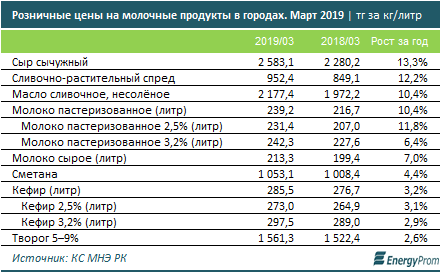 В то же время сыр подорожал за год сразу на 13,3 процента, до 2 583,1 тенге за килограмм; сливочно-растительный спред - на 12,2 процента, до 952,4 тенге за килограмм; сливочное масло - на 10,4 процента, до 2 177,4 тенге за килограмм; пастеризованное молоко - на 10,4 процента, до 239,2 тенге за литр.
