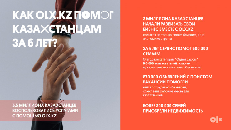 OLX.kz ежемесячно посещают более чем 8,5 миллиона уникальных пользователей в Казахстане. Каждый 2-й казахстанец посещает ОLX.kz минимум раз в месяц. За 6 лет существования сервиса в Казахстане более 3 миллионов казахстанцев начали развивать свой бизнес с OLX.kz. Каждый день пользователи совершают 18 миллионов поисковых запросов на OLX.kz, в месяц эта цифра превышает в среднем отметку в 560 миллионов запросов.