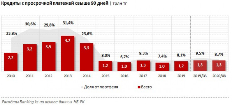 Параллельно с кризисной стагнацией кредитного рынка по сектору растет объем "плохих" кредитов. Так, наиболее опасные займы с просрочкой платежей свыше 90 дней (NPL 90+) к сентябрю достигли уже 1,32 триллиона тенге — сразу на 10,1 процента больше, чем в начале года. Доля NPL 90+ в совокупном ссудном портфеле БВУ РК составила 8,7 процента против 8,1 процента по итогам 2019 года.