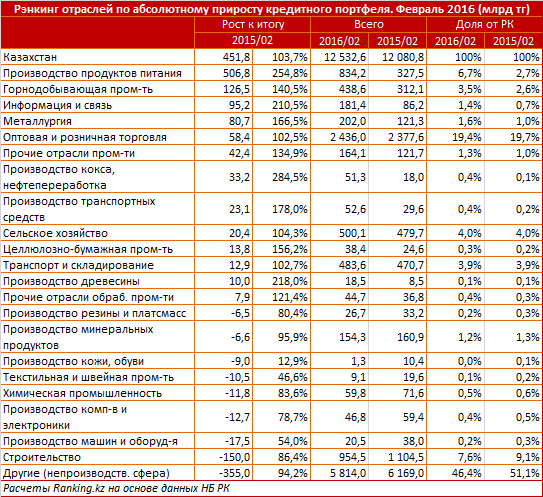 Среди секторов экономики по росту кредитного портфеля за год лидирует пищевая промышленность. Причем в течение всего года кредитование отрасли шло вяло. И только в феврале 2016 года ее портфель за месяц увеличился сразу в 2,6 раза, на 506,8 миллиарда тенге.