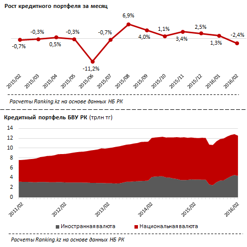 После шести месяцев непрерывного роста ссудный портфель банков за февраль 2016 года уменьшился на 2,4 процента, в том числе тенговые кредиты просели на 1,6 процента. Такие данные приводит аналитическая служба Ranking.kz.