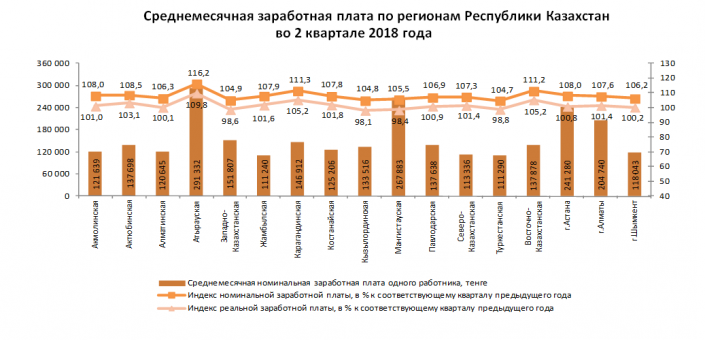 В региональном разрезе самая высокая номинальная заработная плата отмечена в Атырауской области - 291,3 тысячи тенге, что в 1,8 раза превышает среднереспубликанский показатель. В Жамбылской области ее величина составила 111,2 тысячи тенге, что на 31,7 процента ниже среднего уровня по стране.
