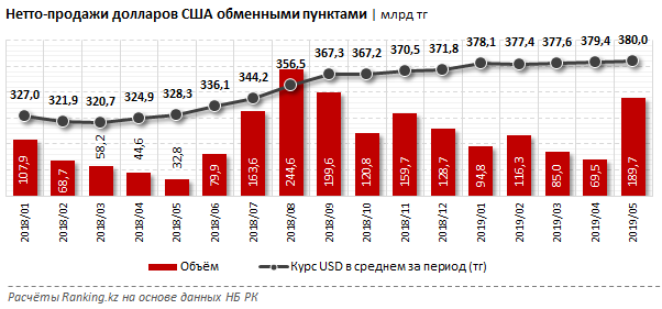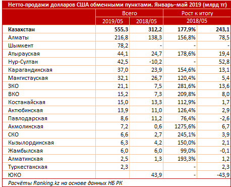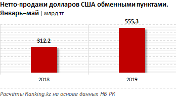 В целом за январь-май 2019 года объем нетто-продаж долларов обменными пунктами составил 555,3 миллиарда тенге, что на 77,9 процента больше по сравнению с аналогичным периодом прошлого года.