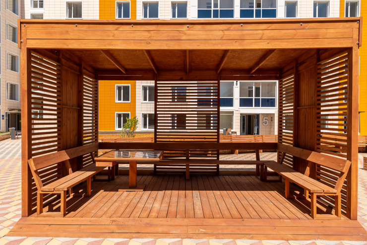 Важное место в комплексе занимает внутренний двор. Он одинаково хорошо спланирован как с функциональной, так и с эстетической точки зрения. Уникальный ландшафтный дизайн будет содержать малые архитектурные формы. В уютной зоне с беседкой "Карпова" представители разных поколений смогут собраться вместе за увлекательной игрой в шахматы. Мафы расставлены так, чтобы разделять двор на тихую и шумную площадки.
