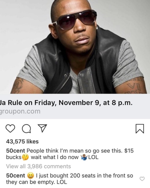 На своей странице в Instagram 50 Cent опубликовал коллаж с "пустыми местами" на концерте Ja Rule и шуточное видео на ту же тему.