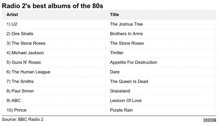 На втором месте в списке BBC расположились Dire Straits с Brother In Arms, далее одноименный альбом The Stone Roses. Также в первую десятку рейтинга вошли Guns N’ Roses с Appetite For Destruction, The Smiths, Prince, Майкл Джексон и другие.