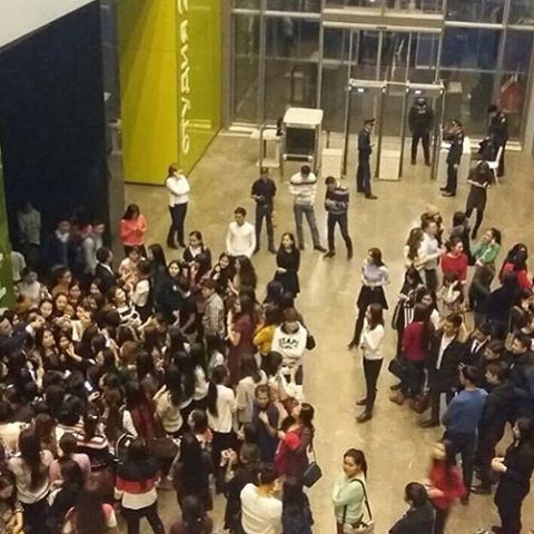 Толпа поклонниц нового мужского коллектива в фойе после съемок программы "Тунги студия". © instagram.com