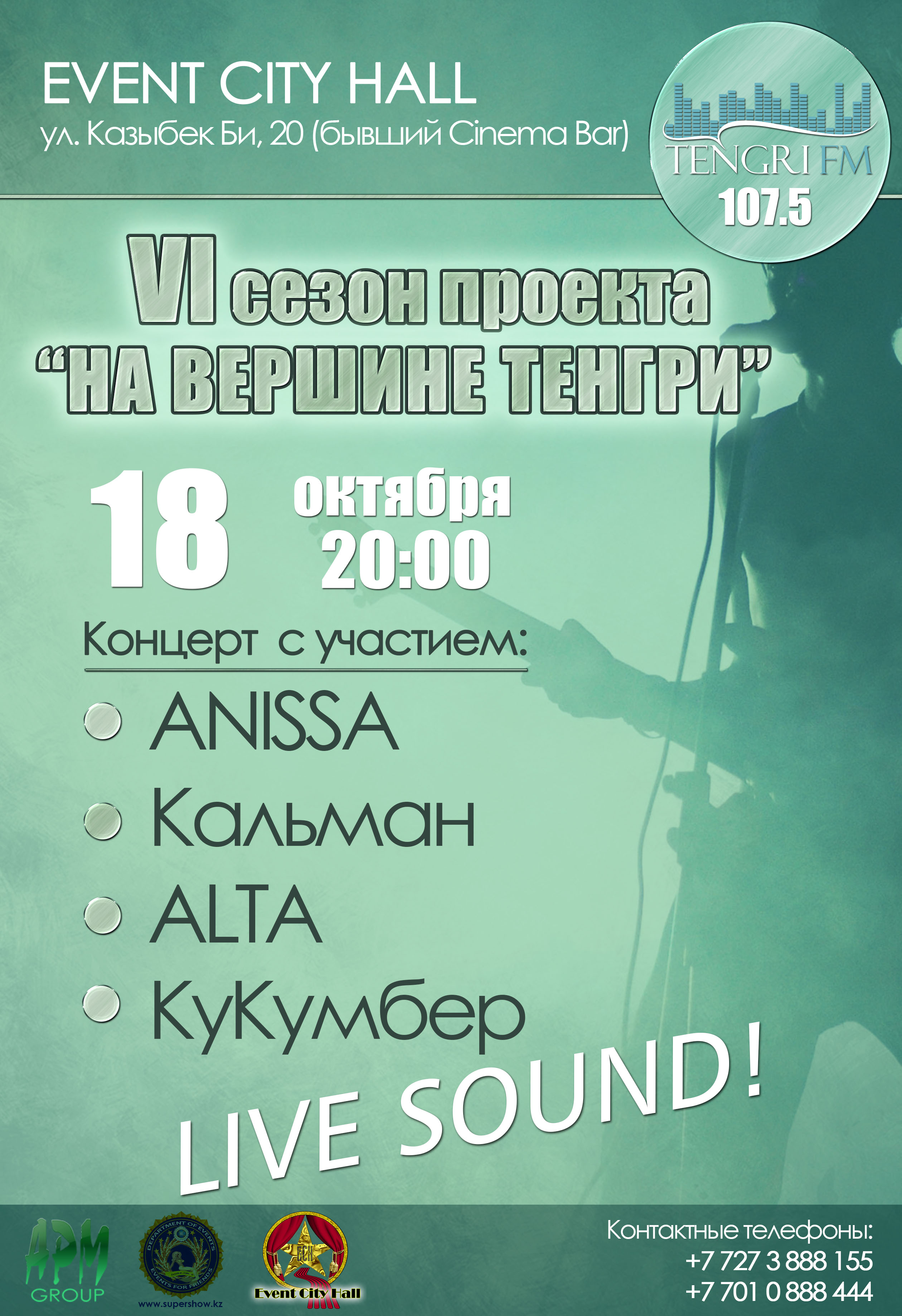 На очередном концерте октябрьской сессии проекта "На вершине Тенгри" радиостанции Tengri FM выступят коллективы "КуКумбер", "Кальман", ANISSA и ALTA, сообщает корреспондент Tengrinews.kz. Концерт, по результатам которого определится третий полуфиналист, пройдет 18 октября в 20.00 в Event City Hall по адресу: улица Казыбек би, 20, угол улицы Калдаякова (бывший Cinemabar).