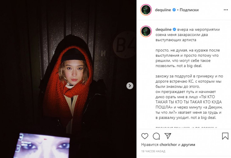 Я трижды подвергалась харассменту, трижды безнаказанно, трижды от всех вами известных рэперов. Молчать об этом больше не буду", - заявила Dequine.