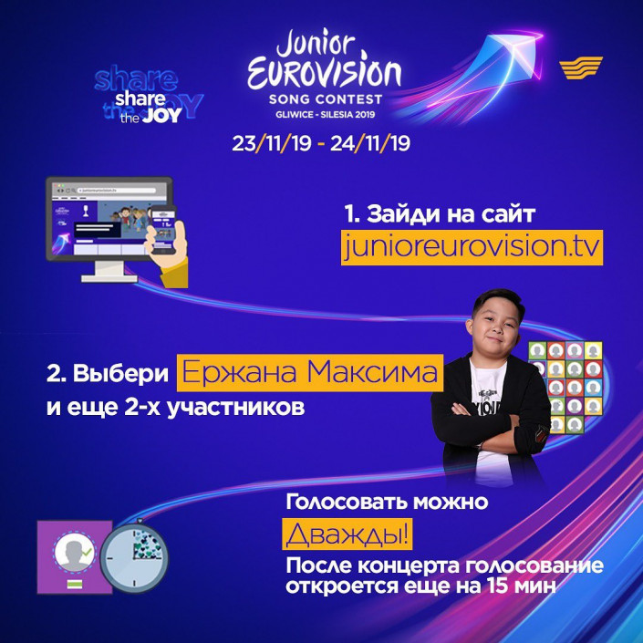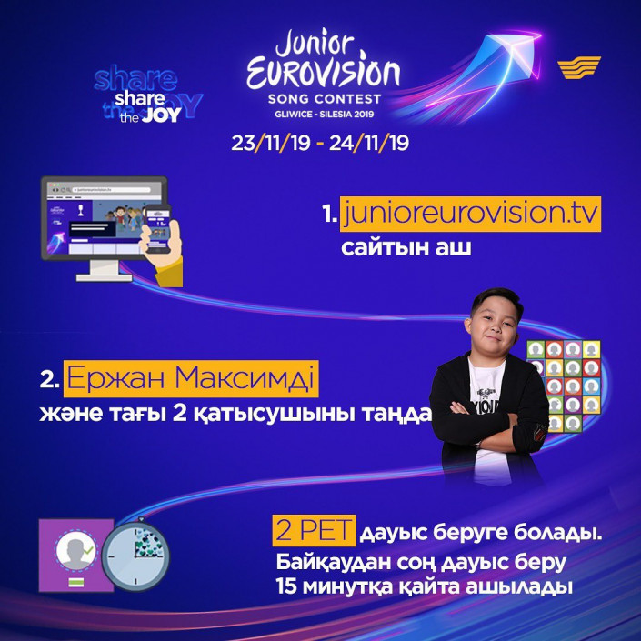 Финал Junior Eurovision 2019 будет транслироваться на канале "Хабар" 24 ноября в 21.00 по времени Нур-Султана. За сутки до окончания турнира, 22 ноября, откроется онлайн-голосование на сайте junioreurovision.tv, где можно будет поддержать нашего земляка.
