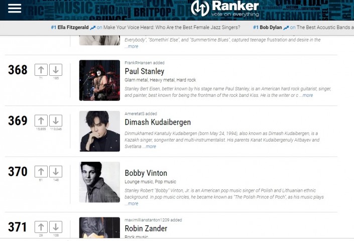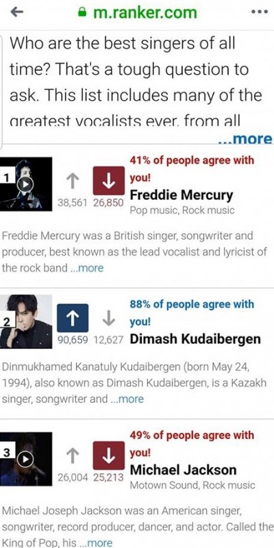 Рейтинг проводился на сайте для опросов Ranker.com. По данным из Википедии, Ranker ежемесячно посещают более 49 миллионов человек. Буквально за несколько часов до закрытия голосования казахстанец располагался на втором месте списка, уступая лишь Фредди Меркьюри. На тот момент за Кудайбергена свои голоса отдали порядка 90 тысяч пользователей.