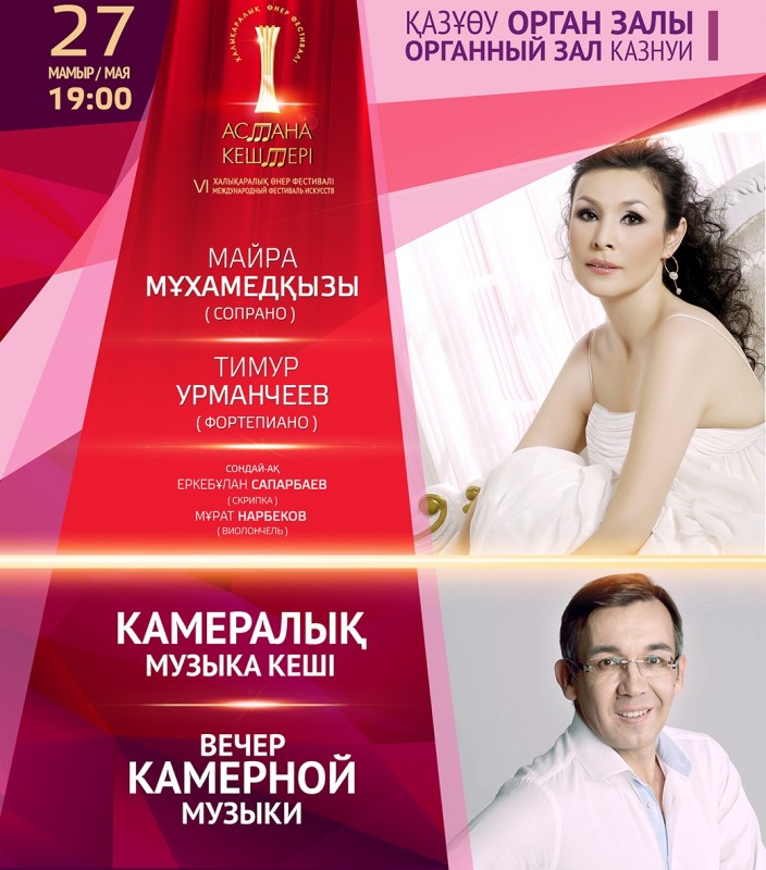 27 мая на вечере камерно-вокальной музыки в органном зале КазНУИ своими выступлениями порадуют ведущая солистка столичной оперы Майра Мухаммедкызы, заслуженный деятель РК Тимур Урманчеев на фортепиано и другие музыканты.