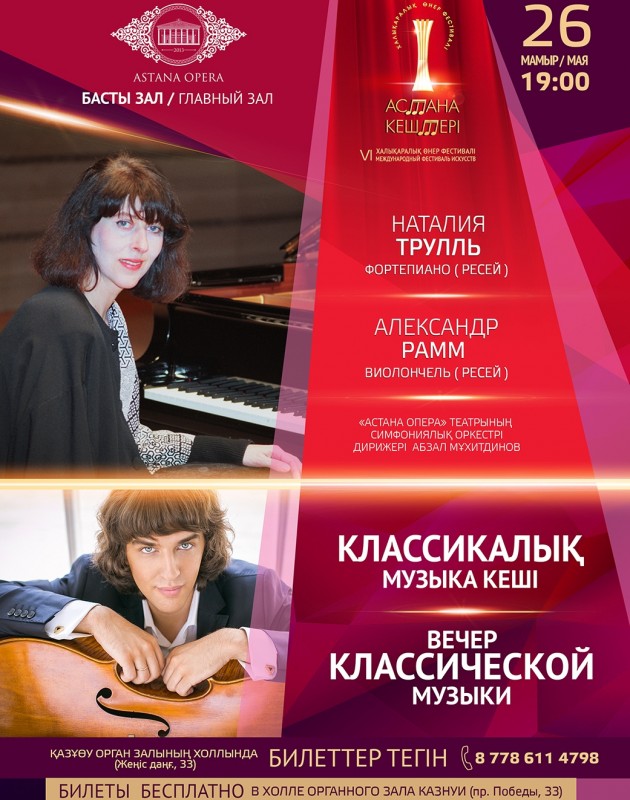 В фестивале принимают участие исполнители классической, народной, эстрадной музыки из разных стран мира. Так, 26 мая на вечере классической музыки в "Астана Опера" выступят один из самых ярких виолончелистов молодого поколения россиянин Александр Рамм и заслуженная артистка России Наталия Трулль на фортепиано, а также симфонический оркестр театра, дирижером которого является заслуженный деятель Казахстана Абзал Мухитдинов.