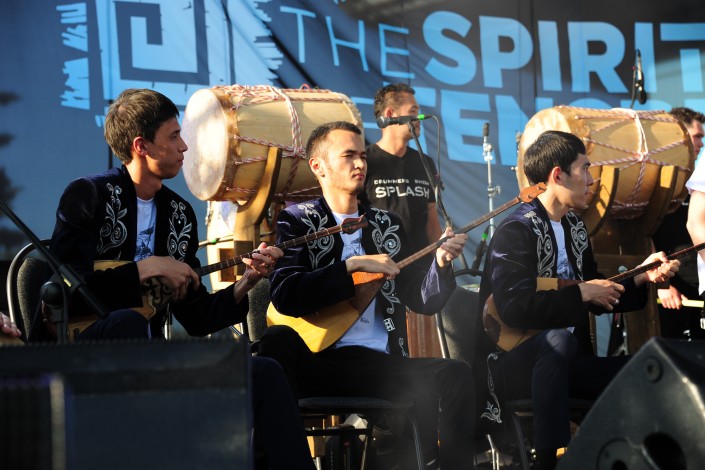 Первыми на сцену вышли музыканты проекта "Барабаны Алматы", которые сразу же "зажгли" публику своим динамичным выступлением. Вместе с ними на сцену вышли домбристы Национальной консерватории имени Курмангазы, а также группа Huun Huur Tu из Тувы. Выступление порой превращалось в своеобразный поединок между струнными и ударными инструментами, причем бой барабанов иногда напоминал раскаты грома.