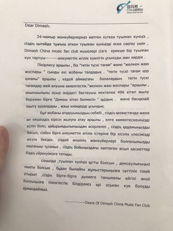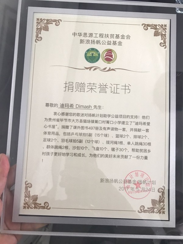 Фанаты вручили Димашу почетную грамоту "Социальное удостоверение доброты".