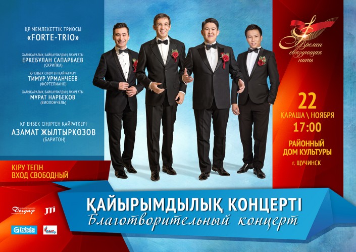 Концерт пройдет в областной филармонии имени Г. Курмангалиева в 18.30. 19 ноября благотворительный вечер для ветеранов состоится в Аксае (Западно-Казахстанская область) в районном Доме культуры, начало в 18.00. А 22 ноября концерт пройдет в Щучинске Акмолинской области в районном Доме культуры, начало в 17.00. Перед участниками ВОВ выступят известные казахстанские исполнители. Это коллекти­в FORTE -TRIO: кавалер ордена "Курмет" и заслуженный деятель РК Тимур Урманчеев, первая с­крипка Государственного симфонического ор­кестра РК и Государственного каме­рного оркестра "Камерата Казахстана" Еркебулан Сапарбаев, а также виолончелист, лауреат международных ­конкурсов Мурат Нарбеков. Кроме того, выступит заслуженный деятель РК, оперный певец Азамат Жылтыркозов.