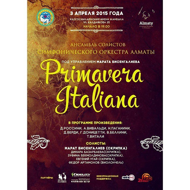 Концерт классической музыки Primavera Italiana пройдет на сцене Казахской государственной филармонии имени Жамбыла. В программе вечера прозвучат произведения Джоаккино Россини, Антонио Вивальди, Никколо Паганини и Джузеппе Верди. В концерте классической музыки примет участие и дочь Марата Бисенгалиева - начинающая актриса и музыкант Арухан.