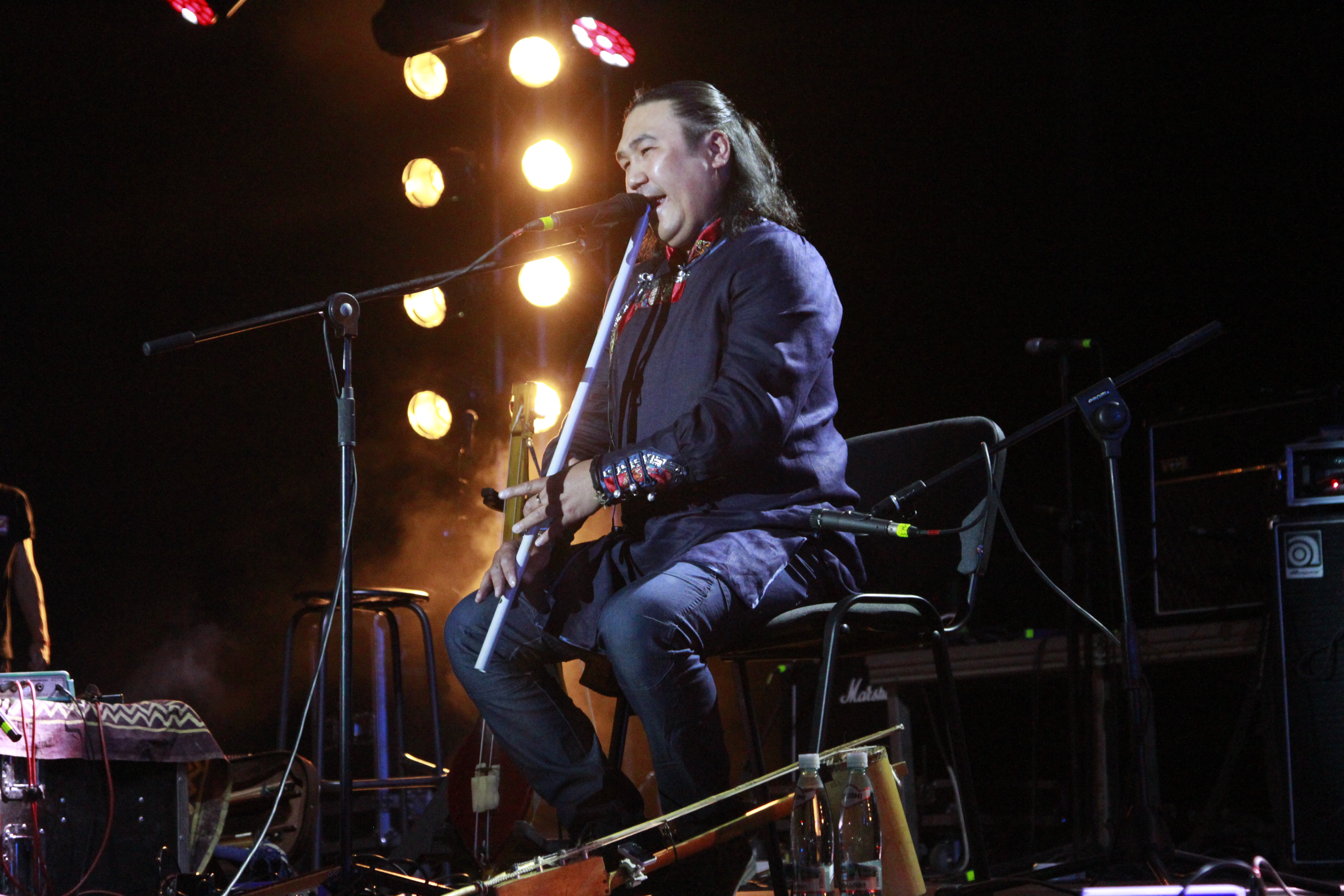 Одним из самых ожидаемых исполнителей стал Радик Тюлюш - мастер горлового пения из Тувы, который, к слову, уже приезжал в Казахстан в 2014 году. На нынешний фестиваль он приехал вместе с группой "Чалама". Исполнители аккомпанировали себе на древних тувинских струнных инструментах - игиле, бызаанчи и дошпулууре. Стоит добавить, что Тюлюш исполнил тувинские песни, которые были сочинены в разных странах, где проживает эта народность - в частности, в Казахстане и в Монголии.