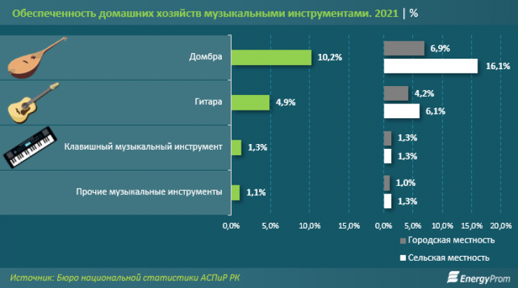 Согласно данным обследования Бюро национальной статистики АСПиР РК, проведенного в 2021 году, среди 11,7 тысячи опрошенных домашних хозяйств во всех регионах страны у 10,2 процента имелась в наличии домбра, у 4,9 процента - гитара, у 1,3 процента - клавишный инструмент, еще 1,1 процента домохозяйств были обеспечены прочими музыкальными инструментами.