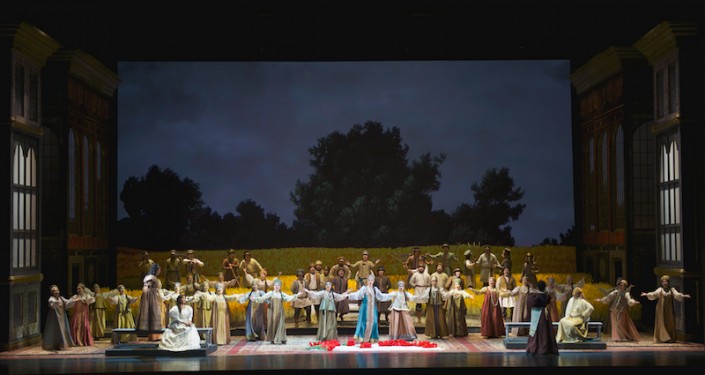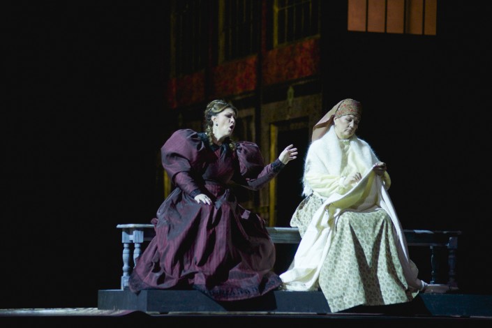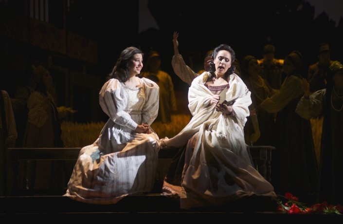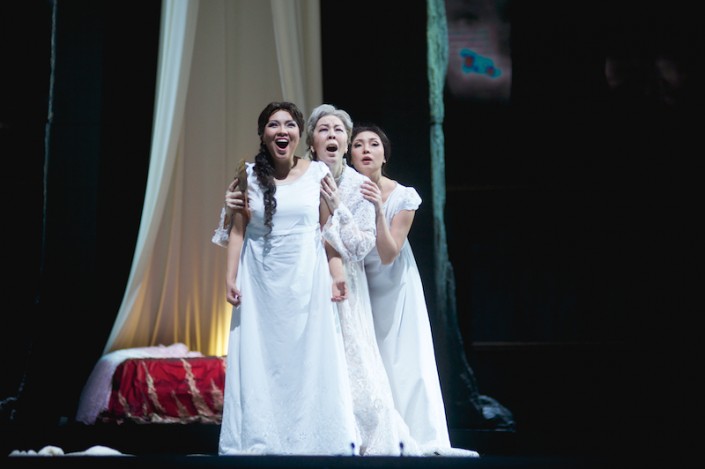 Технические возможности театра позволили создавать сценографам невероятные эффекты: пожилая Татьяна в мгновение ока скрылась под сценой, а ей на смену чудесным образом появилась скамья с Лариной (Гульжанат Сапакова, Маргарита Дворецкая) и няней (Салтанат Муратбекова, Баян Жусупова). Их рассуждения о жизни прервали крестьяне, появившиеся из глубины сцены на автоматической платформе. Массовая сцена впечатляла своей зрелищностью: 3D-проекции показывали плывущие облака, кроны деревьев покачивались от легкого дуновения ветра, а густая пшеница из виртуальной картины переходила в реальную. Артисты хора прекрасно справились с поставленной задачей, их голоса звучали протяжно и мелодично.