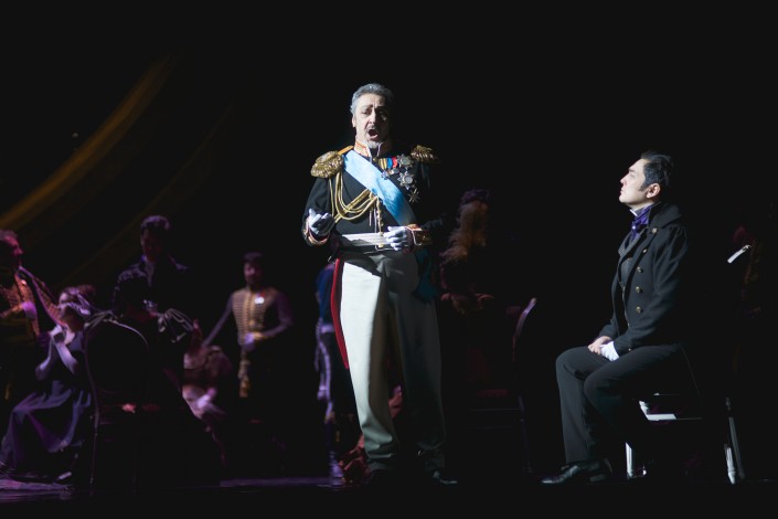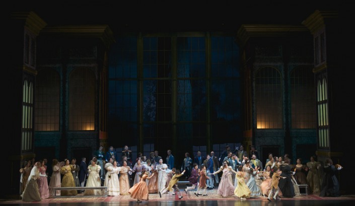 Одной из самых ярких в постановке была сцена греминского бала. Особо здесь следует отметить работу художников по костюмам Софьи Тасмагамбетовой и Павла Драгунова. Им прекрасно удалось передать стиль эпохи. Кружась в вальсе, грациозные дамы в синих платьях замечательно гармонировали с мужчинами во фраках. А всю картину дополняла озаряющая пространство вокруг потрясающей красоты хрустальная люстра невероятных размеров. С полной уверенностью можно сказать, что это уникальная сценография, ни на одной площадке мира нельзя встретить подобного изящества.