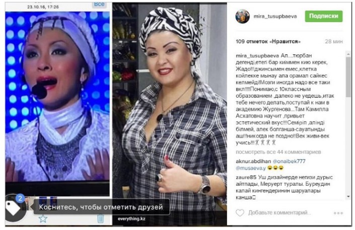 "Я считаю, что здесь какой-либо вины Меруерт Тусупбаевой нет. Считаю частную жалобу Жадо необоснованной. Во-первых, она сама первая в программе на одном из телеканалов оскорбила мою доверительницу, высказав мнение, что у нее безвкусица, плохо одевается, тем самым подорвала имидж, имя Тусупбаевой. Такие выводы могут делать только лицензированные, дипломированные эксперты моды. И то, эксперт моды при даче такого заключения будет давать осторожно, в культурном виде, не оскорбляя честь и достоинство человека. В данном случае, я считаю, что дизайнер Жадо не имела права давать такую критику. Именно дача такой критики дала основание для ответа. В этом ответе Меруерт применила фольклорную казахскую пословицу, которая придумана не ею. Это пословица "Ит жоқта шошқа үреді". ("Когда нет собаки, лает свинья"). Именно казахи применяют в разговоре пословицы и поговорки. А их применение не является каким-либо оскорблением. Потому что это устное фольклорное творчество казахского народа", - объяснила Кабанбаева.