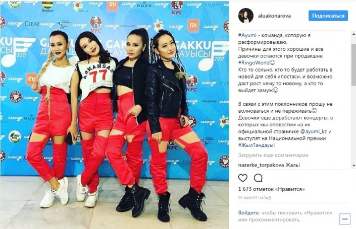 "Причины для этого хорошие, и все девочки остаются при продакшне RingoWorld. Кто-то сольно, кто-то будет работать в новой для себя ипостаси и, возможно, даст рост чему-то новому, а кто-то выйдет замуж. В связи с этим поклонников прошу не волноваться и не переживать. Девочки еще доработают концерты, о которых мы оповестим на их официальной страничке @ayumi_kz и выступят на национальной премии #ЖылТандауы!", - сообщила Конарова.