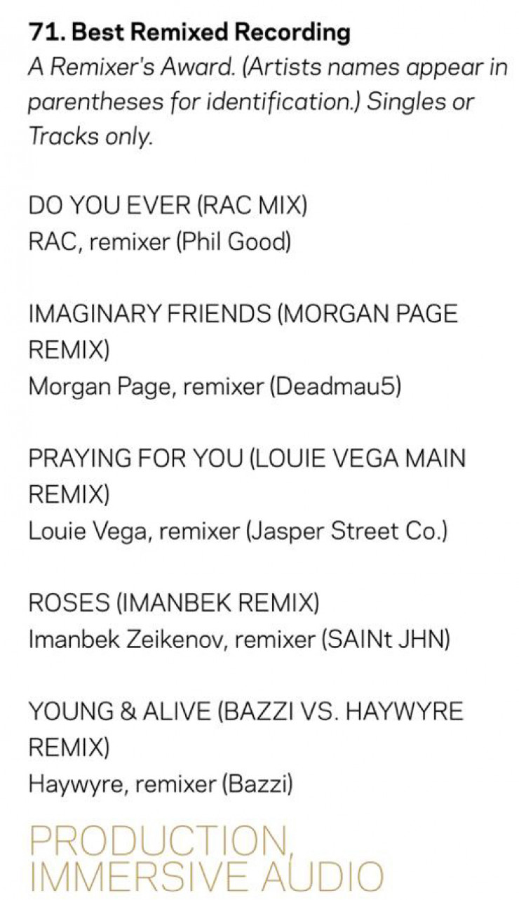 Ремикс казахстанца Иманбека Зейкенова (Imanbek) на композицию Roses SAINt JHN номинирован на премию "Грэмми" (Grammy), передает корреспондент Tengrinews.kz.