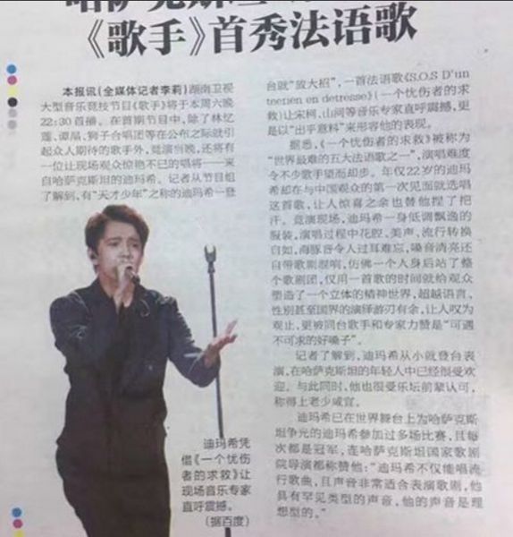 Қытай тілінде басылған жазбадан: "Шоуға Қытай әншілері қатысады, ал Қазақстаннан Димаш есімді әнші келген. Димашқа қытай сарапшылары "талантты, қабілетті әнші" деп баға берді. "Ол француздың ең қиын әнін орындады. Қытай халқы Димашты қошеметпен қарсы алды. Димаш - Тәңір өз назарына алған жас әнші (称为“天才少年”的迪马西 一出台就放大招)" деген сөздерді оқуға болады. Теленұсқа жарыққа шықпаса да, әлеуметтік желіде Димаштың қытай тілінде айтқан әні кең тарады.