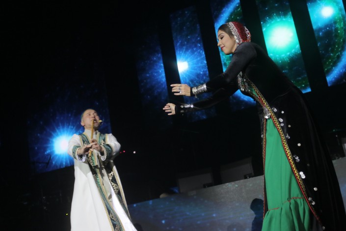 20.48 На сцене выступила Чылтыс Таннагашева. Она является первой шорианкой, овладевшей горловым пением.