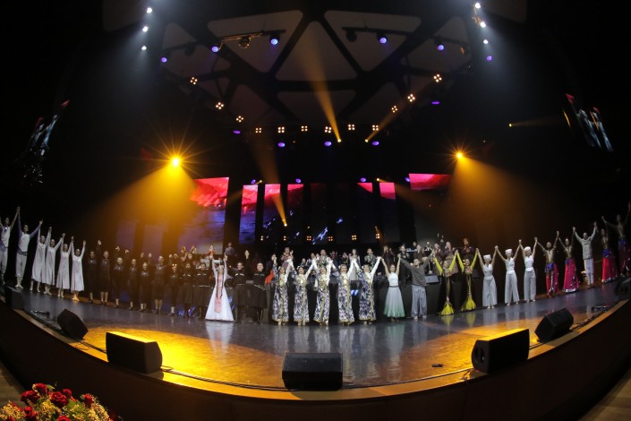 "Мы смотрели национальные танцы, и нас осенило, что синергия песни и танца должна дать совершенно невероятный эффект по своему качеству и эмоциональному воздействию. Это удивительно красивый и очень сложный проект. То, что вы увидите на сцене, - это сложнейшая технологическая работа, потому что совместить живое исполнение с танцами, наложить на это компьютерную графику и определенную идеологическую концепцию оказалось очень-очень сложным мероприятием", - отметил Батыр Казыбаев.