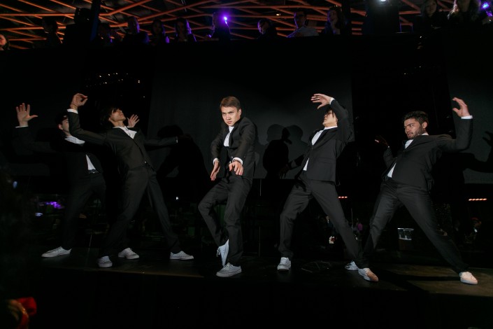 Сюрпризом для музыкантов и собравшихся стало появление танцоров из коллектива Dance Life в смокингах. Они вышли на возвышение возле сцены и начали двигаться под музыку оркестра. Танцоры двигались в такт музыке, разыгрывали пантомимы, уходили со стенда и возвращались обратно.
