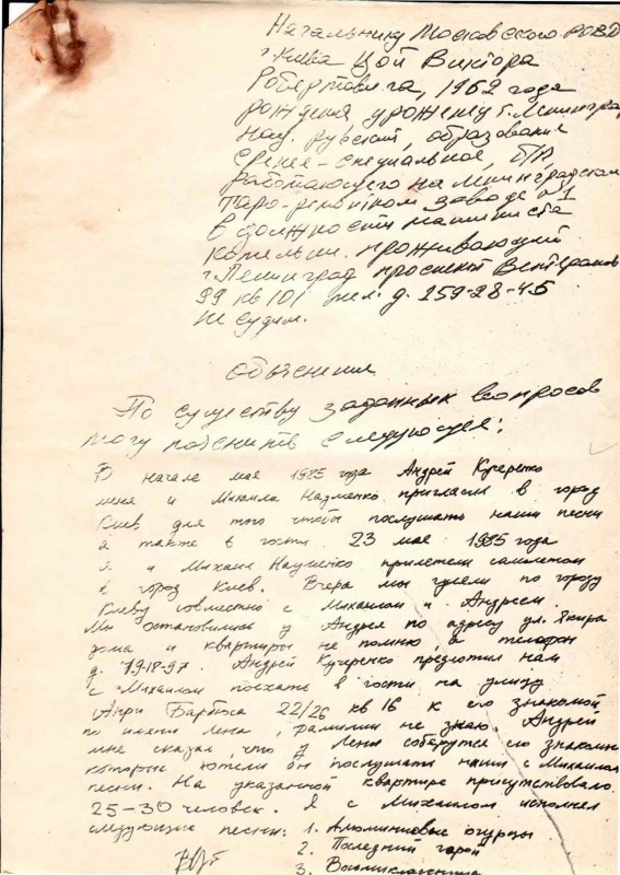 "Начальнику Московского РОВД г. Киева [от] Цой Виктора Робертовича, 1962 года рождения, уроженец г. Ленинграда, национальность русский, образование средне-специальное, б/п, работающего на ленинградском таро-ремонтном заводе № 1 в должности машиниста котельни, проживающий г. Ленинград, проспект Ветеранов 99 кв 101 тел. 1592845, не судим