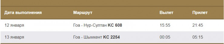 Также на 12 и 13 января запланированы рейсы из Гоа в Нур-Султан и Шымкент соответственно.