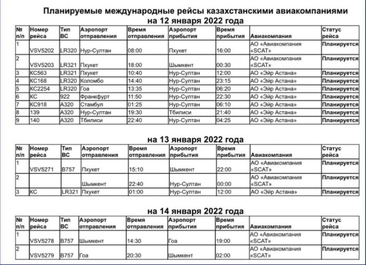 Международные рейсы из/в Нур-Султан на 11 января 2022 года