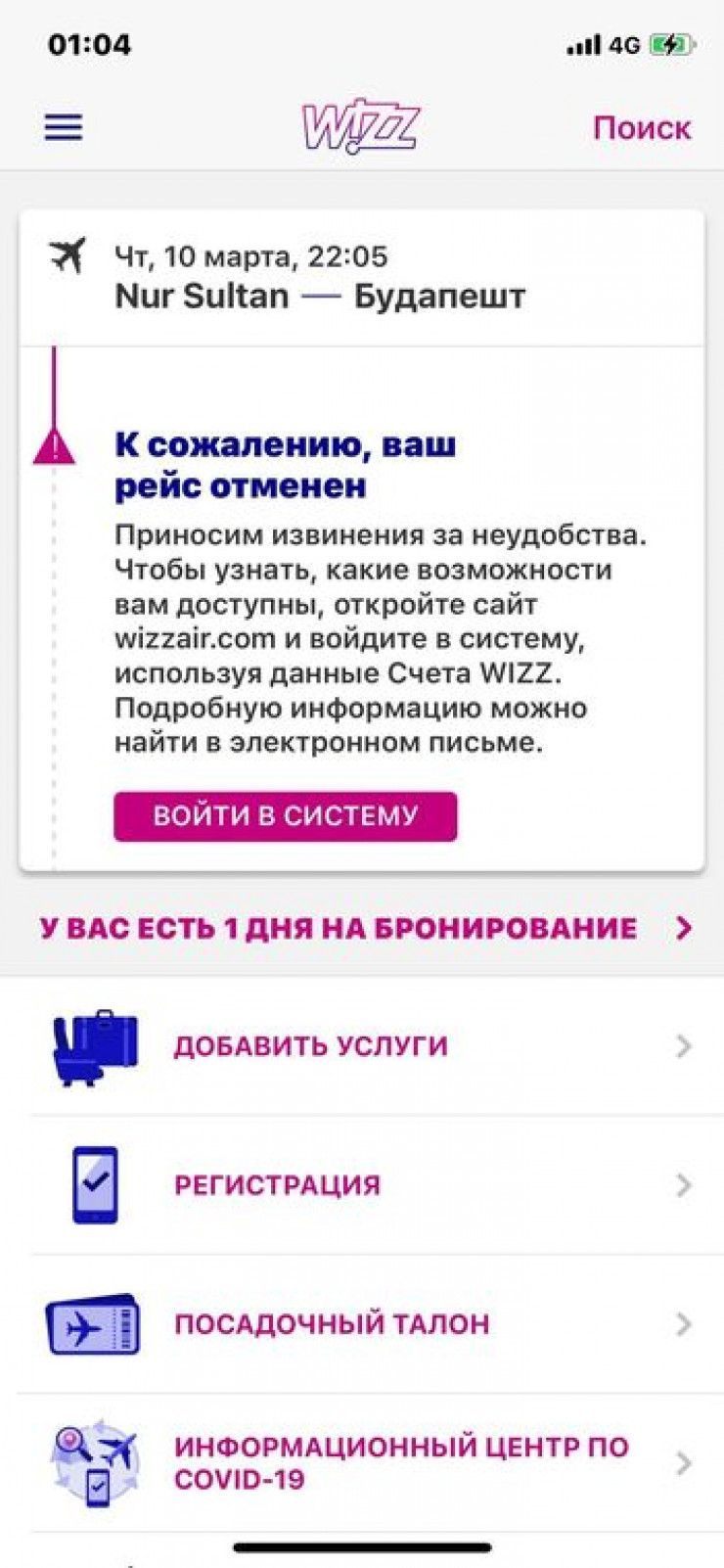 Wizz Air в письме предложил вернуть деньги или поменять рейс. Но из Казахстана ничего больше не летает у них. Я не знаю, делают ли они возврат денег всем, я маме покупала билет, где можно было менять дату или оформить возврат", - рассказывала девушка корреспонденту.