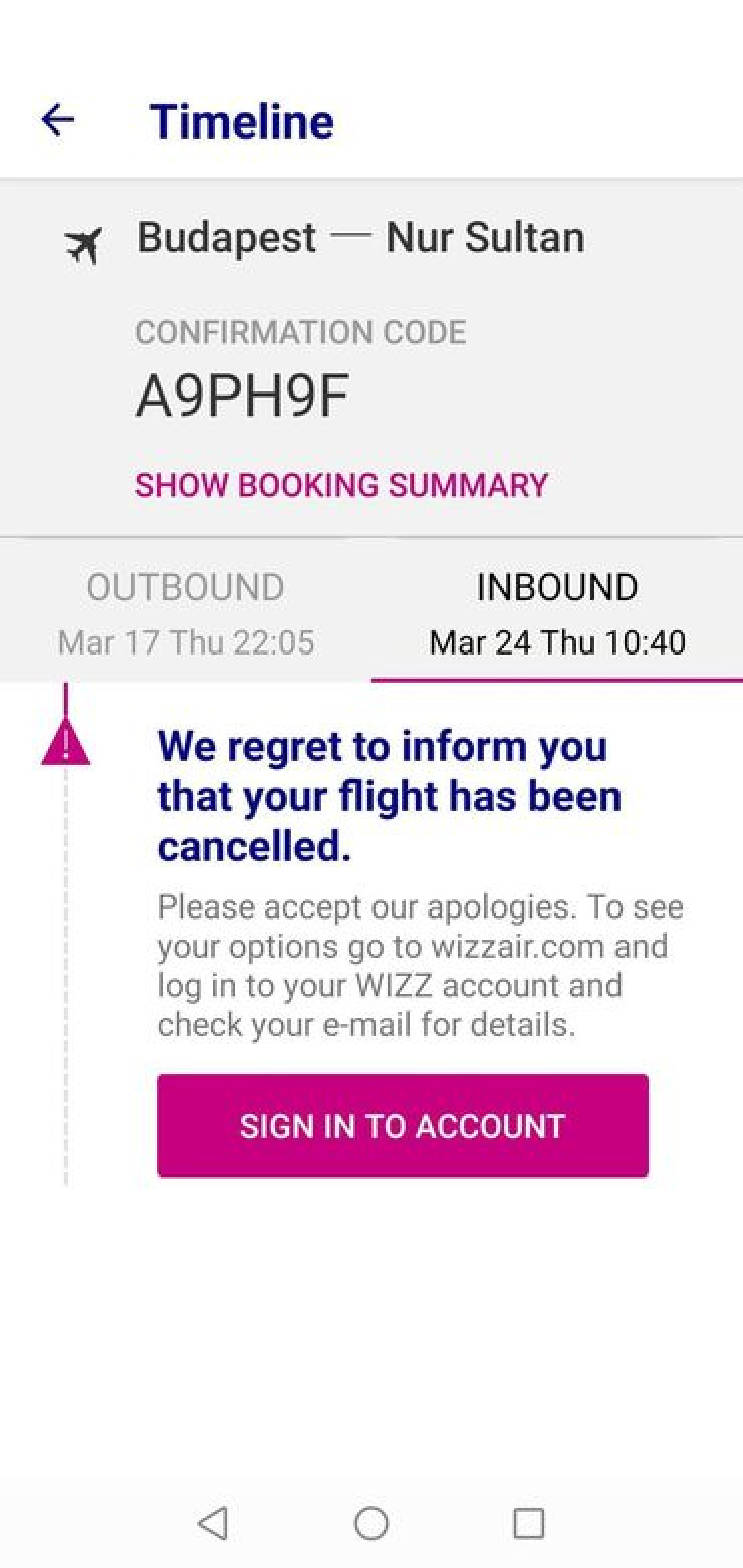 Один из пассажиров, Асет Маханбетов, рассказал, что планировал вылететь из Нур-Султана 10 марта, а 17 числа вернуться. О том, что рейс отменен, мужчина узнал, зайдя в приложение Wizz Air.