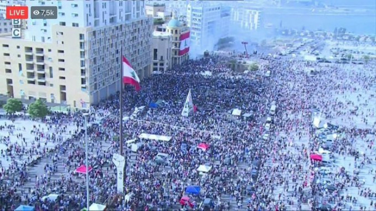 Absolutely staggering numbers toay in #Beirut. Square split between peaceful on one side and rioting on the other. We’re hearing live fire every now and then. Over 100 injured so far. #LebanonProtests pic.twitter.com/C4cpYhyJIQ